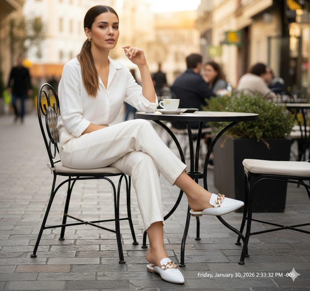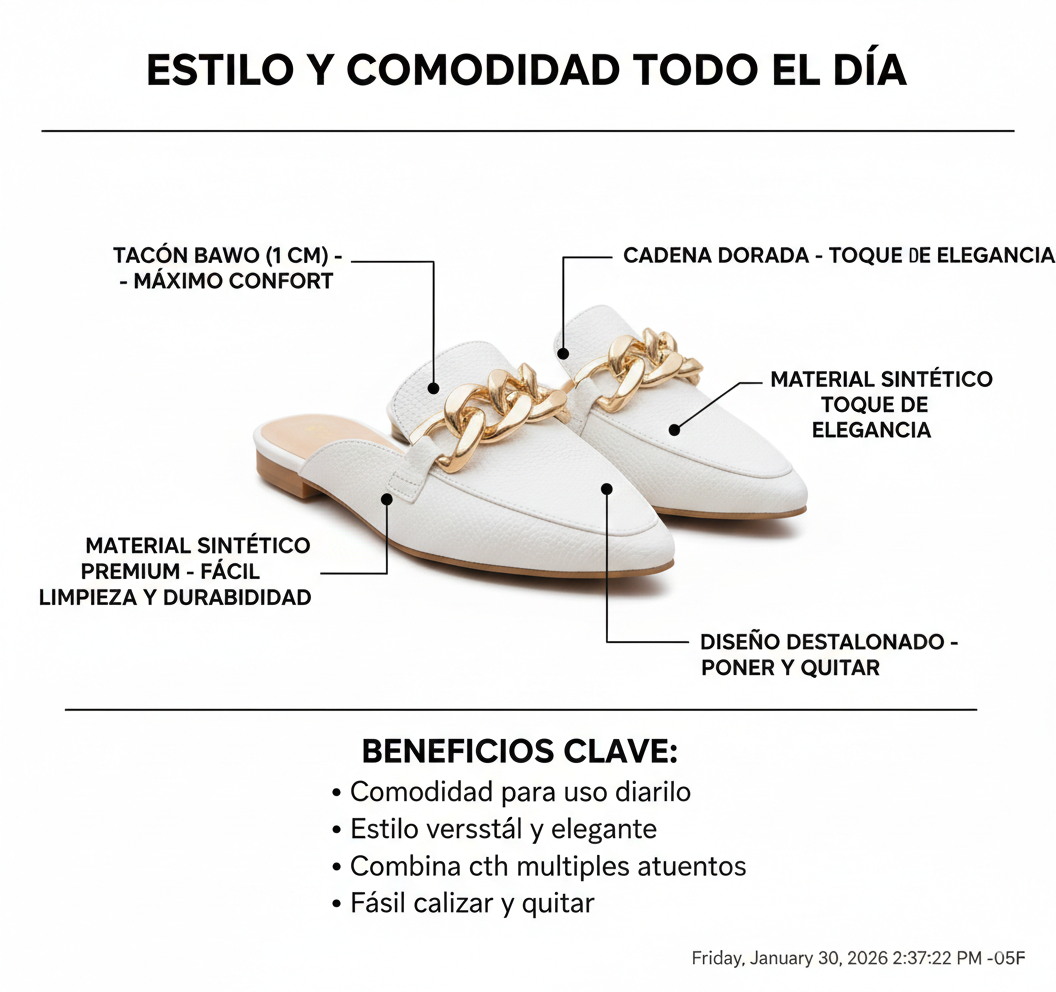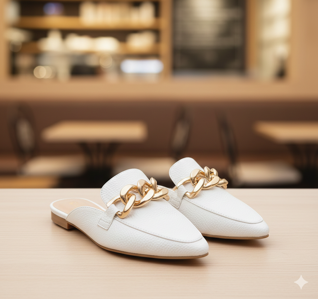 Este mule blanco es el complemento ideal para un look limpio, elegante y actual 🤍✨. La cadena dorada 💛 añade un aire de lujo que transforma cualquier outfit sencillo en uno cómodo. Perfecto para mujeres que buscan estilo, practicidad y versatilidad en un solo zapato 👡💫.