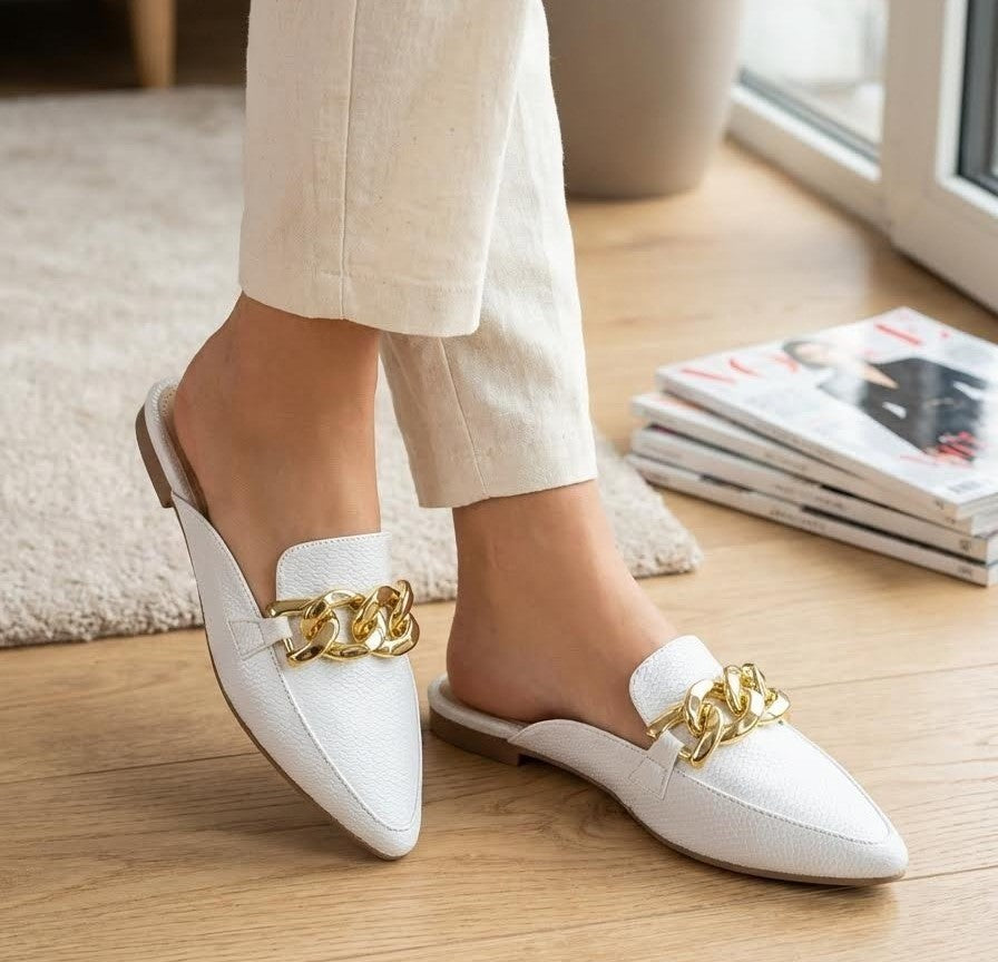 Nuestro mule blanco con cadena dorada 💛 es cómodo, chic y súper combinable 👡. Ideal para elevar tu look diario con un toque cómodo 💫.