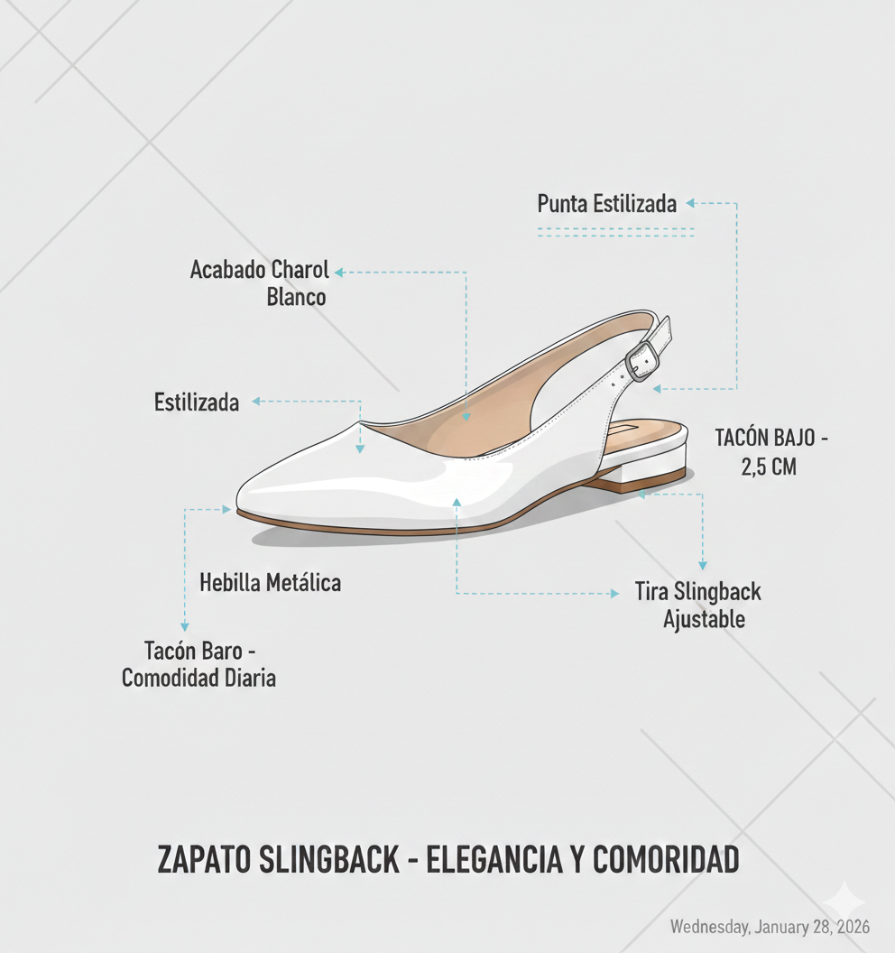 Este zapato tipo slingback combina un diseño clásico y minimalista con la practicidad necesaria para el día a día. Su acabado en blanco pulido ofrece un aspecto limpio y cómodo que complementa tanto atuendos formales como casuales de oficina.