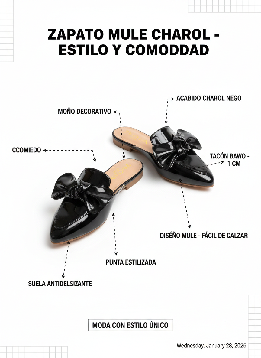 Elegancia y comodidad en un solo diseño. Este zapato tipo mule destaca por su acabado en charol negro brillante y un moño frontal que aporta un toque femenino y sofisticado.